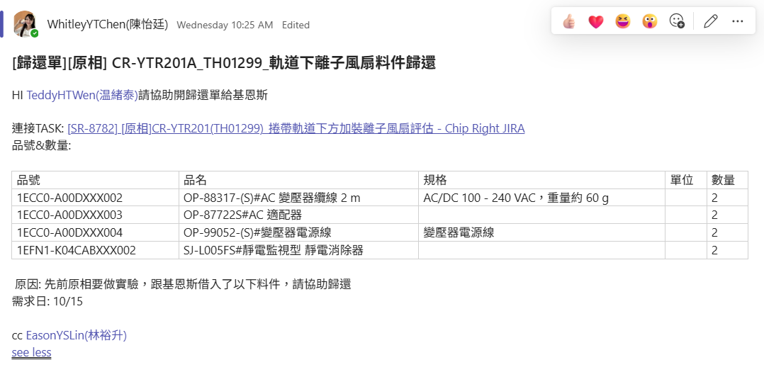 各部門於 TEAMS 頻道申請物料時,請依下列格式發文: